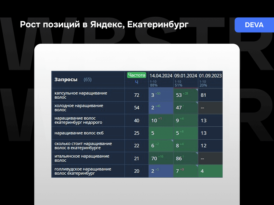 DEVA — сеть премиум-салонов по наращиванию волос в трёх мегаполисах: Москве, Санкт-Петербурге и Екатеринбурге. Основной запрос клиента: «Сделать сайт рабочим с точки зрения SEO и заявок». Сайт уже приносил трафик, но изначально был сделан как «визитка» и не закрывал задачи SEO: не хватало подробной информации об услугах, ценах и визуальном контенте, критичном для ниши. Зависимость от платной рекламы при этом оставалась высокой.